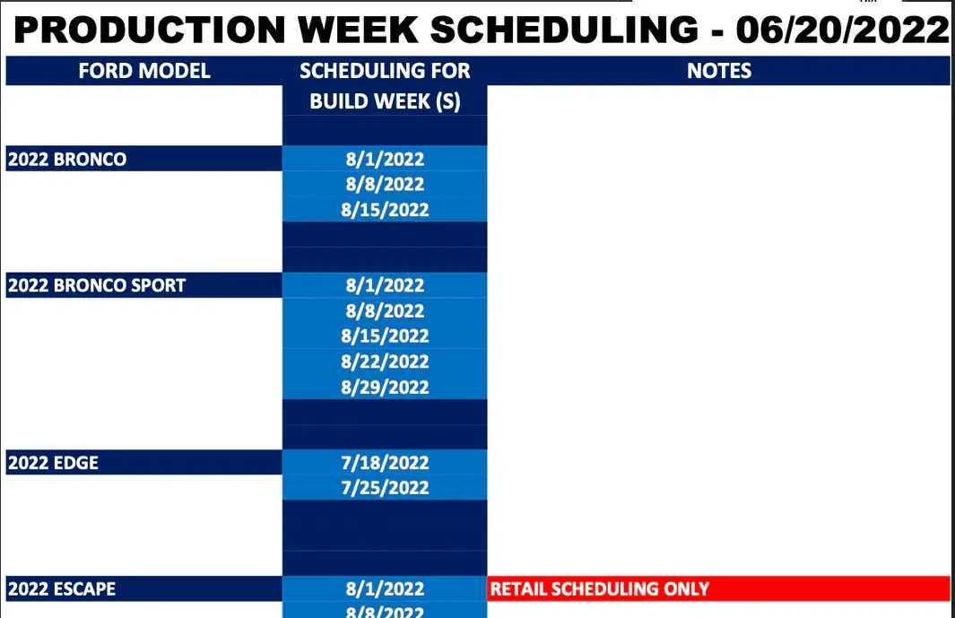 At least you have a build. Ordered in March and still absolutely nothing. It’s getting old for sure. Some communication from Ford would be nice.They scheduled alright. I just got bumped again for the 3rd time. Originally 6/13 then to 6/27 and I just logged in and now I am 8/8. This is never ending. Happy Monday, now wait another month and a half.