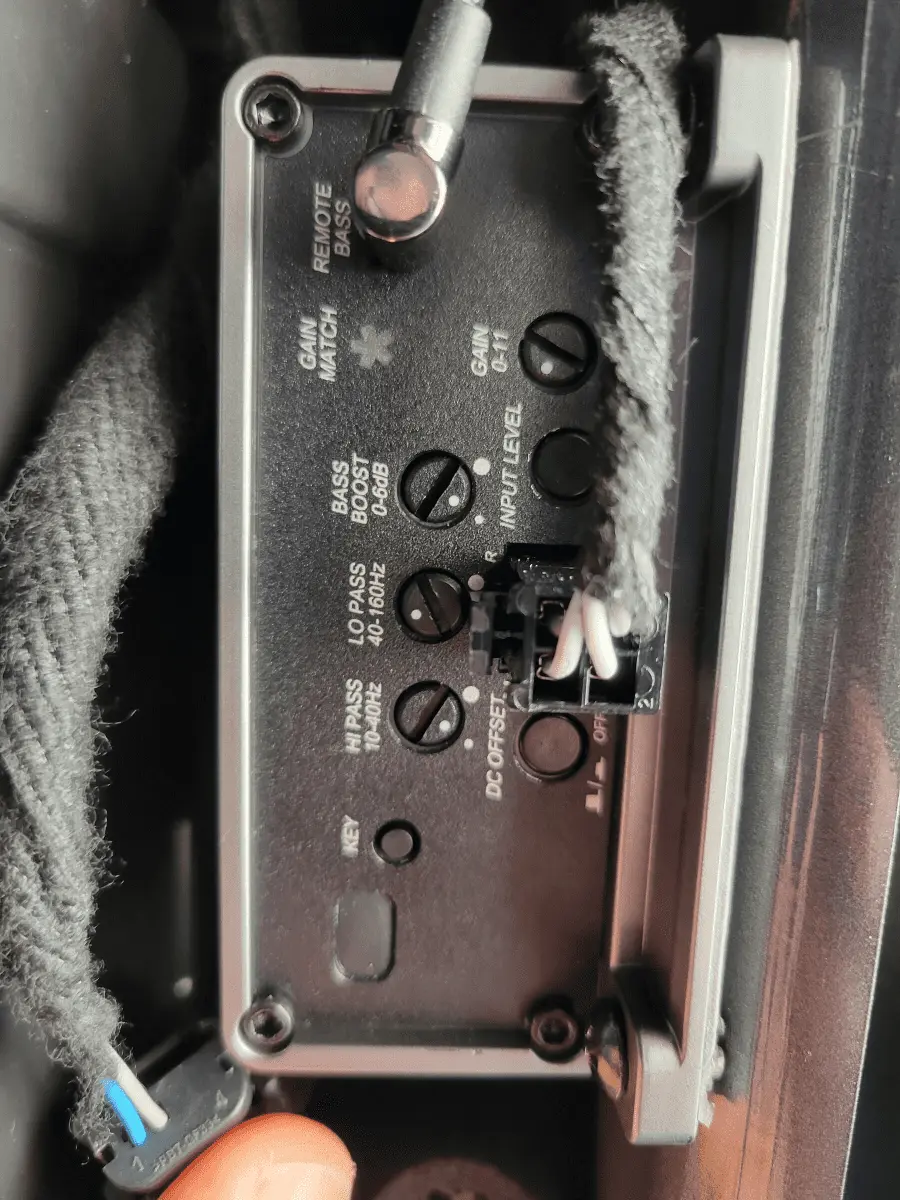 Unclip the green wire connector going to the sub and the three connections into the amp, and unscrew the two screws and two nuts to completely free the sub enclosure from the vehicle.