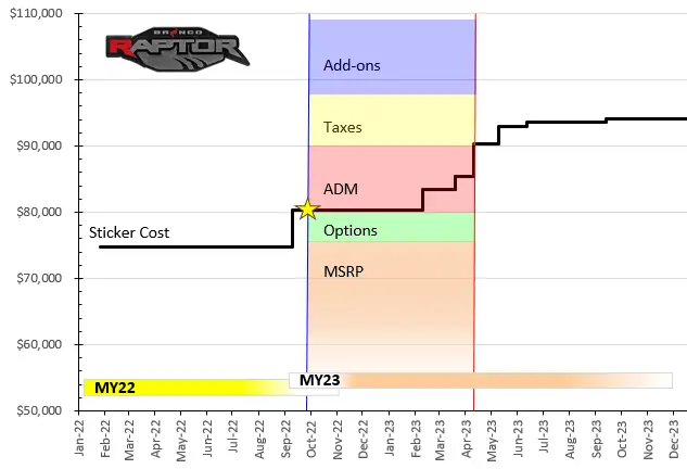 It appears I missed a $500 increase to the MY23 Raptor MSRP; started sometime in SEP-NOV. Now $86,580 before options and D&D.