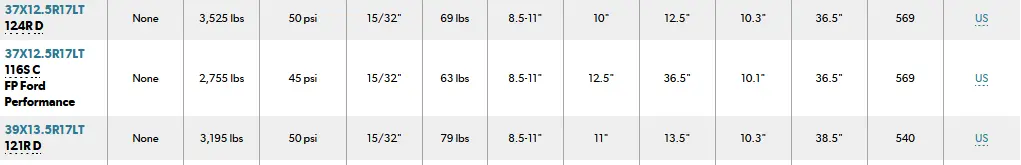 39's or 40's may really help visually balance the proportion of the fender flares. But that's a lot of extra weight. For performance considerations 1 lb extra of unsprung weight is equivalent to adding 10 lbs extra in a vehicle. Below Goodyears are "C" load range, but still very heavy. Note that the 39's above and the 40's would fit on the OEM wheels but clearance is unknown.39's would be some massive and it's probably pretty doable on the Bronco Raptor!