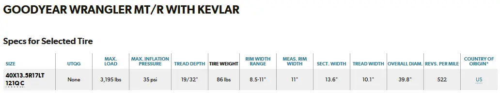 While 40-inch tires would be cool, I'm not sure these tires are that visually appealing...39's or 40's may really help visually balance the proportion of the fender flares. But that's a lot of extra weight. For performance considerations 1 lb extra of unsprung weight is equivalent to adding 10 lbs extra in a vehicle. Below Goodyears are "C" load range, but still very heavy. Note that the 39's above and the 40's would fit on the OEM wheels but clearance is unknown.