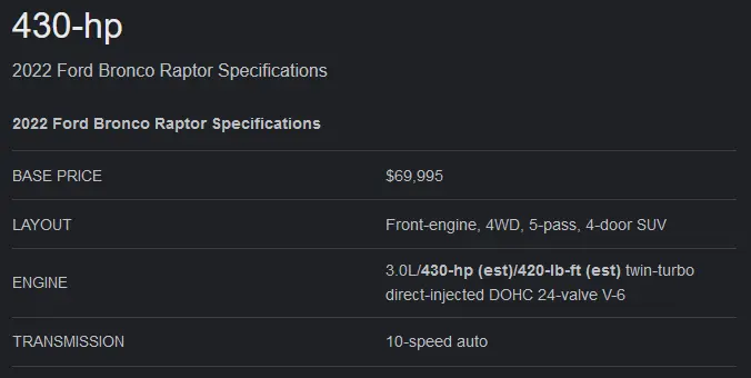 If I am reading this correctly? 430HP and 420TQ. I snipped this from a link I clicked on over at Bronco Nation about fuel economy of the Bronco Raptor.