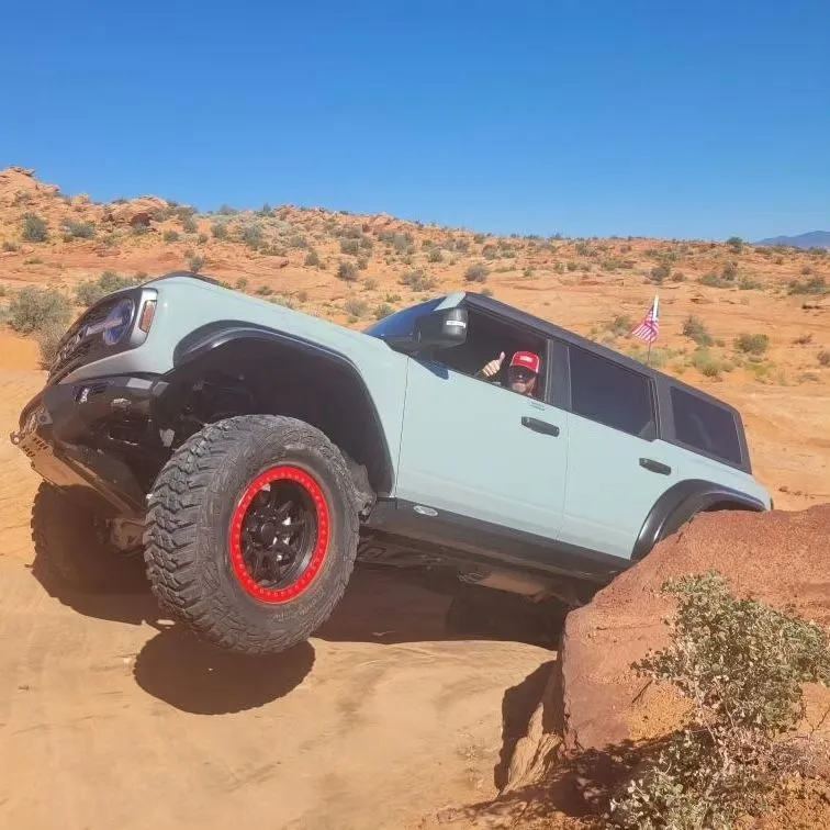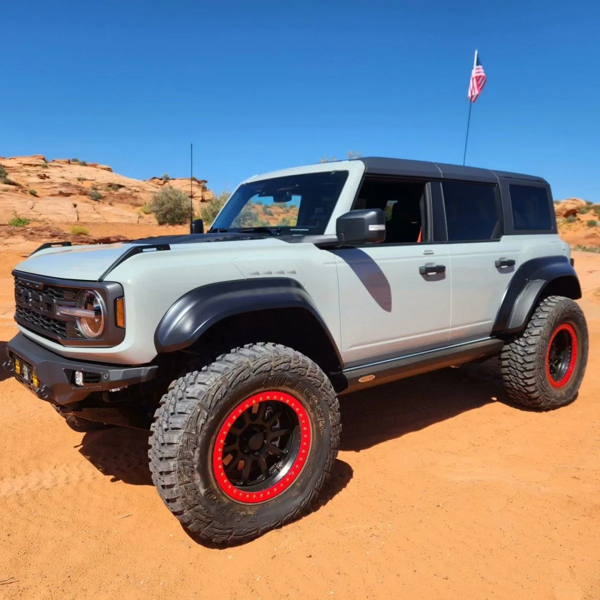 2023 Bronco Raptor, Cactus gray. Upgrades include ADD bumpers, Rigid lights, spare tire delete, Rock Slide Engineering steps, leveling collar, 39” Kenati Mud Hogs, 20” Raceline forged Liberator wheels. On order, Advanced fiberglass 7.5” fenders and Whipple tuner. Also, the tailgate has been debadged.