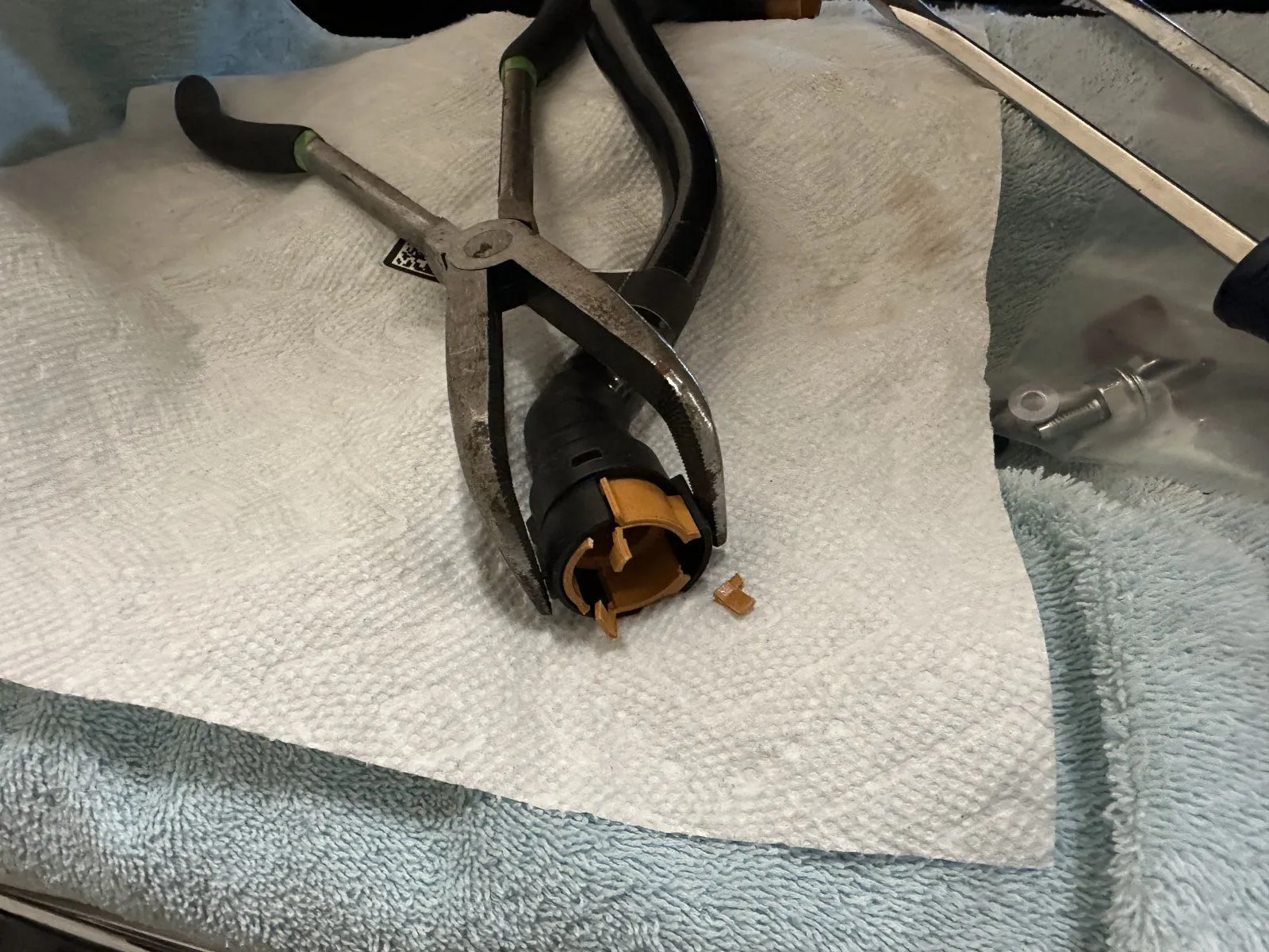 When I got to the Drivers side, the OEM air tube, that this kit replaces, has tamper proof fittings that will break during removal. Then on page 7 of the instructions it recommended to remove the vertical air intake tube in order to remove the air tube lower fitting. This appeared to be the most difficult and time consuming part of the installation. I decided to try removing the lower tamper proof fitting using the pliers shown below which worked quite well and saved a bunch of time in disassembly. Simply grip the pliers with right hand and hold the intake air tube with your left and pull straight up. This technique was easier for me as I was looking straight down from the top side creeper.