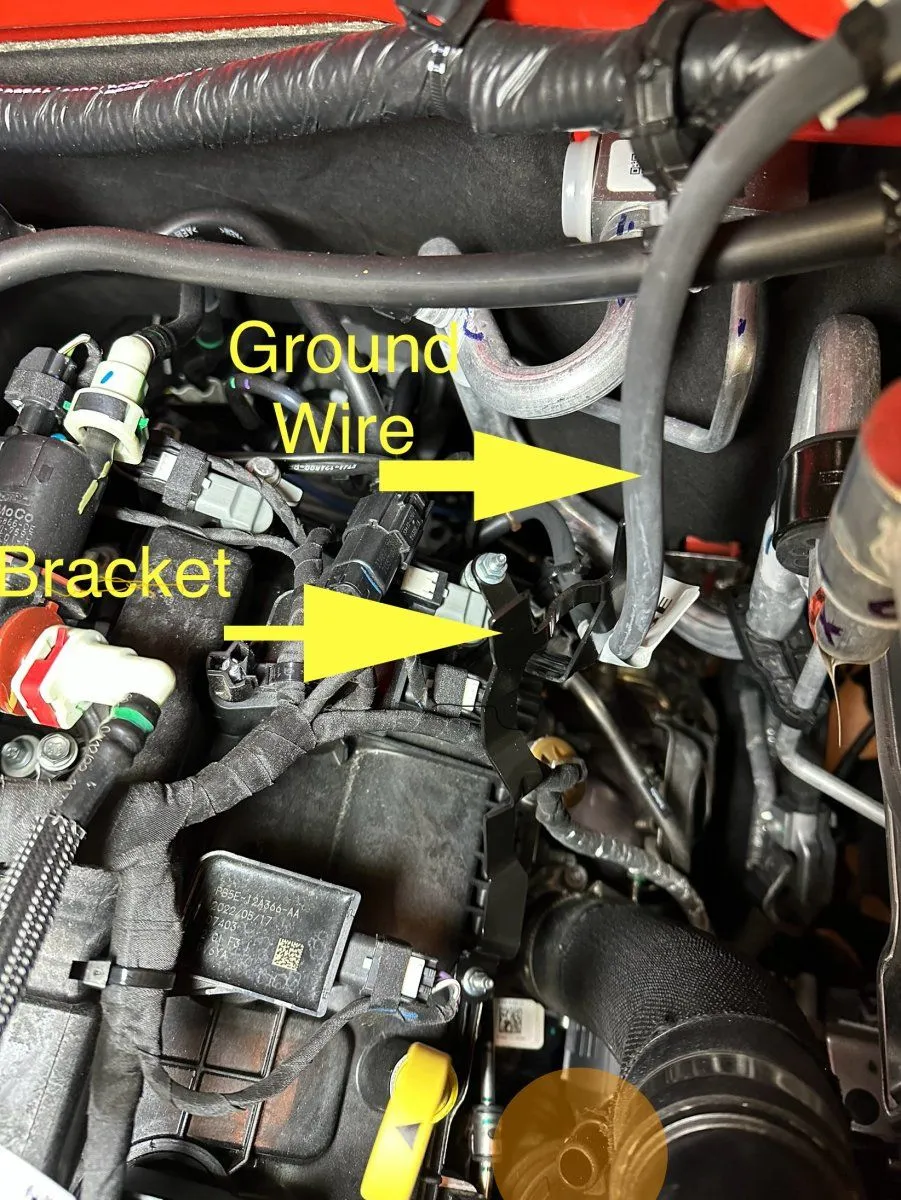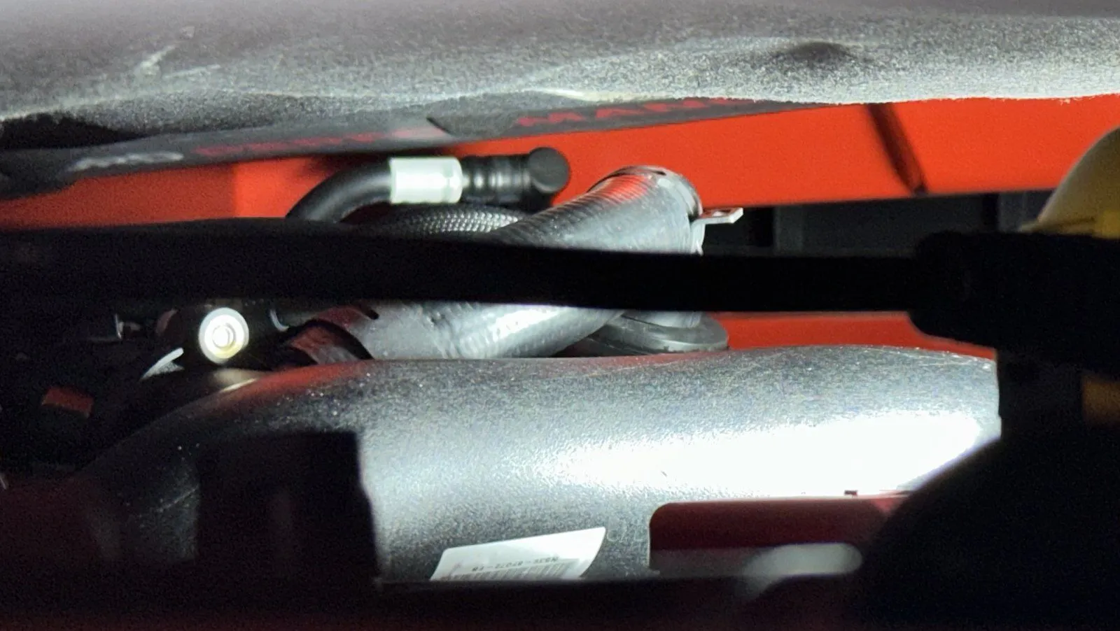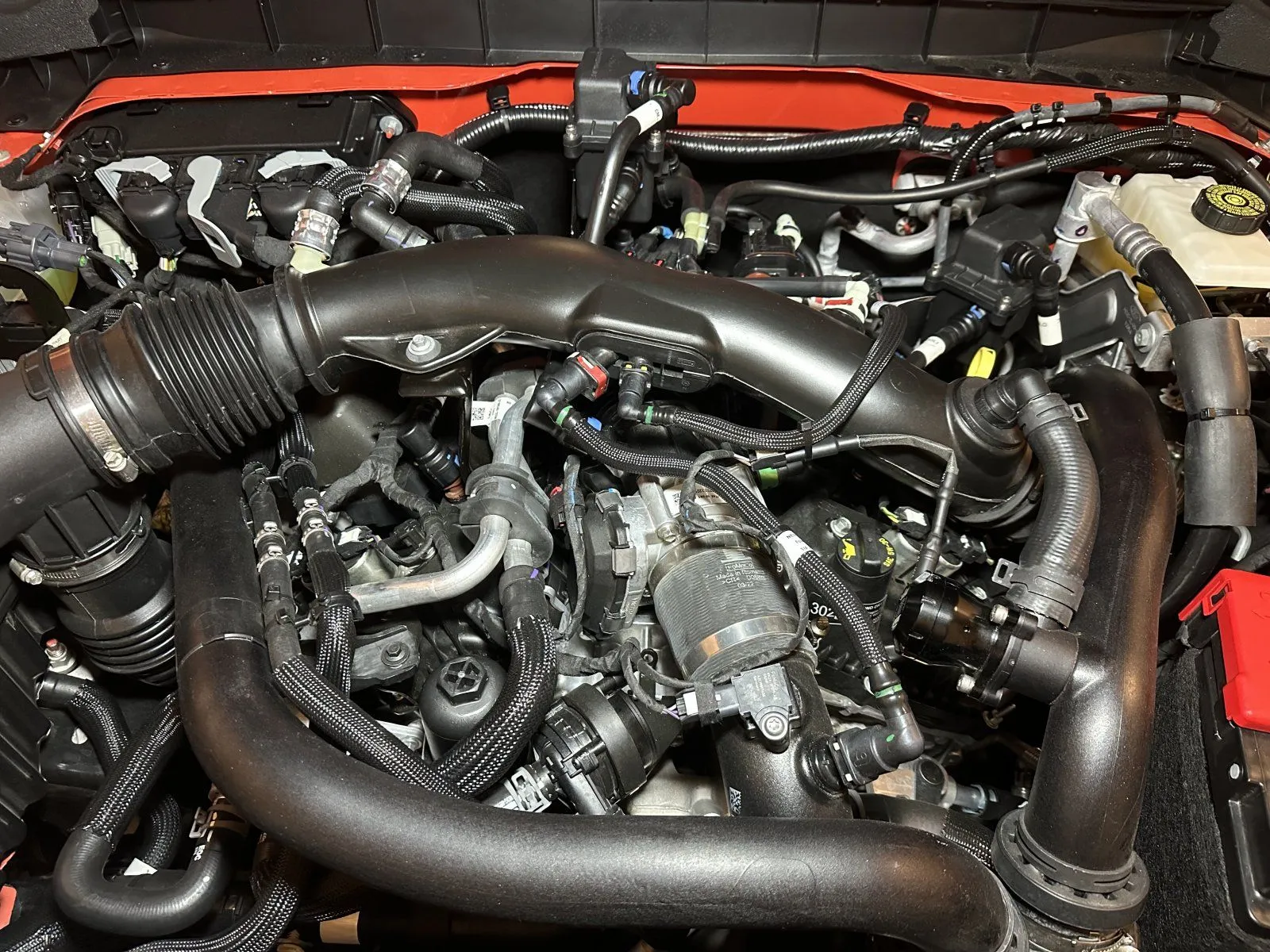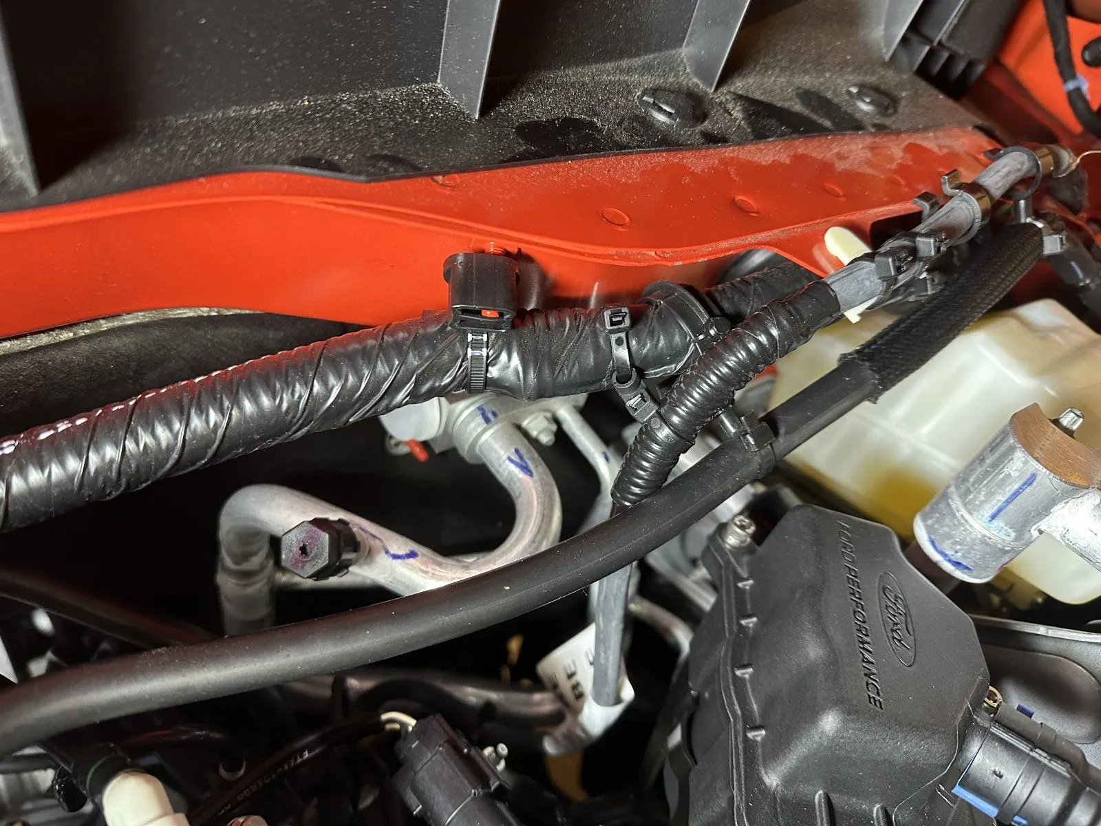 The passenger side canister outlet tube is closer to the hood liner than I would like, curious if others have noticed any abrasions in the "Ford Performance" area on the liner. Pic below take from drivers side front corner with hood closed between latch and safety latch allowing enough space to take the photo below.