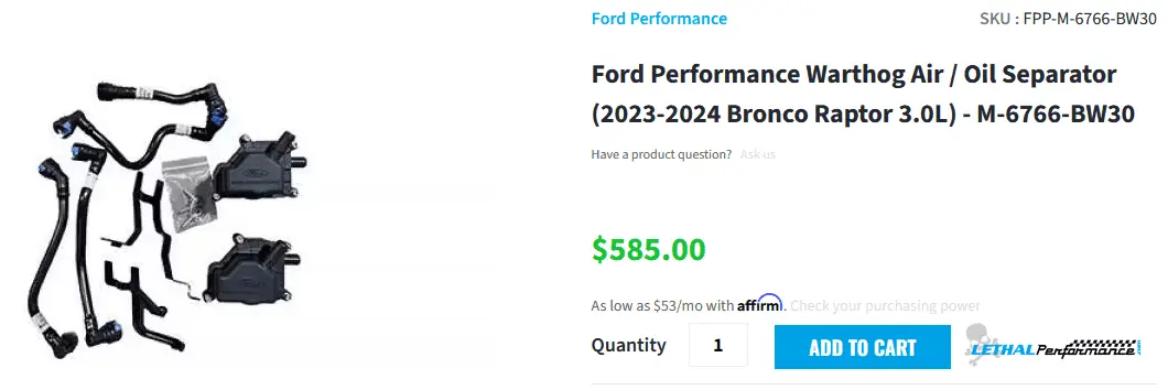Installed the Ford Performance Air/Oil Separator SKU: M6766BW30 and removed my previously installed UPR single valve catch can. If I would have had the UPR dual valve I don't think I would have seen the value in changing to this Ford Performance unit.