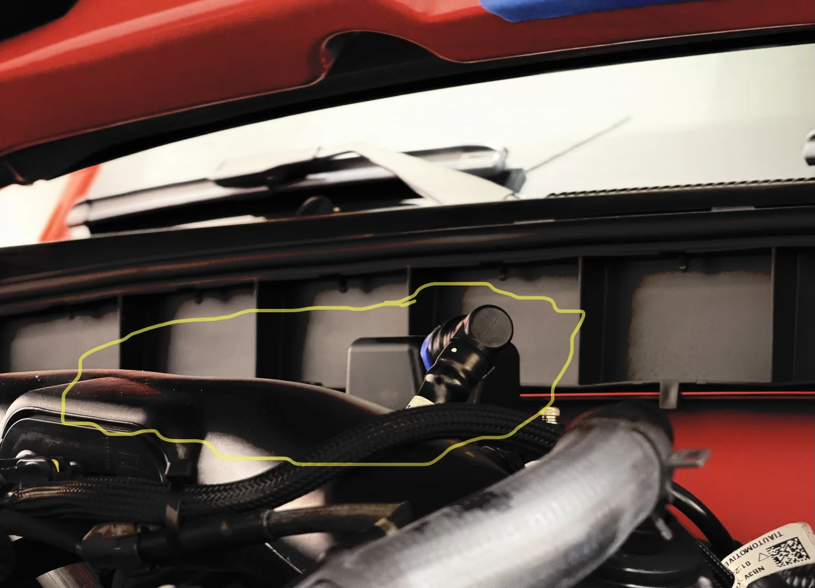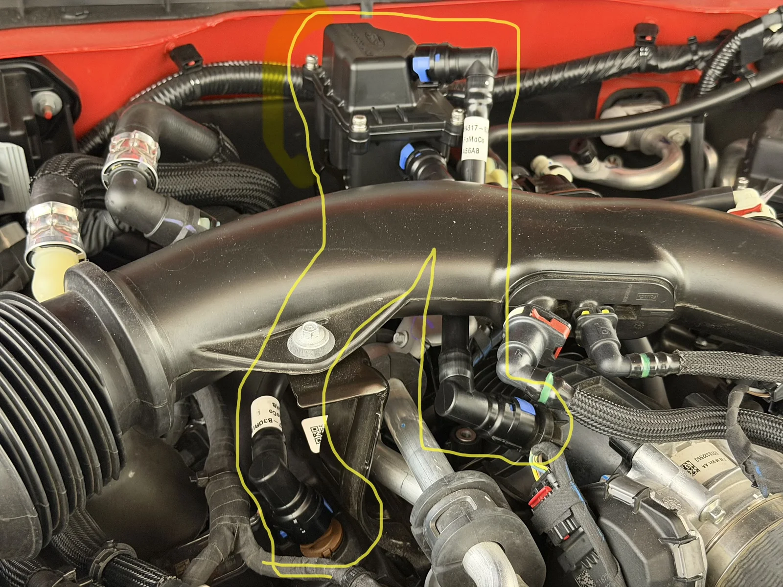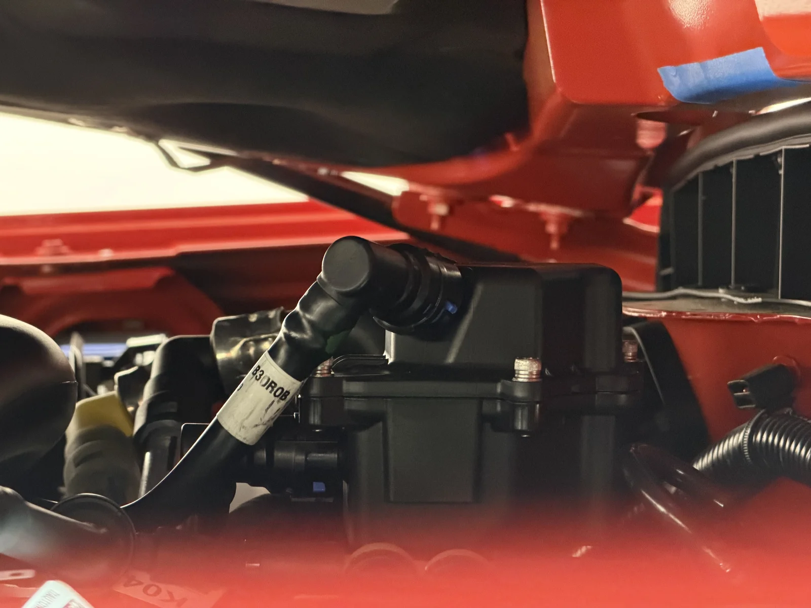 The passenger side canister outlet tube is closer to the hood liner than I would like, curious if others have noticed any abrasions in the "Ford Performance" area on the liner. Pic below take from drivers side front corner with hood closed between latch and safety latch allowing enough space to take the photo below.