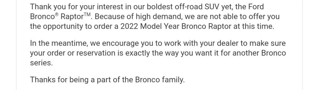 Congratulations...not sure how you got it yesterday but I'm happy for anyone that was able to get a Bronco Raptor.Yaaaaaa, Whopppeeeeeee.........Thank You Jesus!!!!!! If you have not figured it out....Got my notification yesterday.......Orders for the Raptor open in March for us lucky ones.....Yeaaaaa