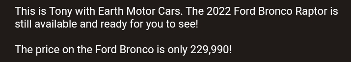 They do have a CO Bronco Raptor with 265 miles which is probably the one you were inquiring about.
