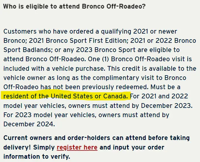I'm not a lawyer, but as far as I'm concerned, the Off-roadeo is a gift. If you bought a Bronco seconded hand then you don't get a gift. If you already got a gift, then you don't get a second gift. Period, end of story, stop whining, stop trying to get something for nothing. You're not entitled.