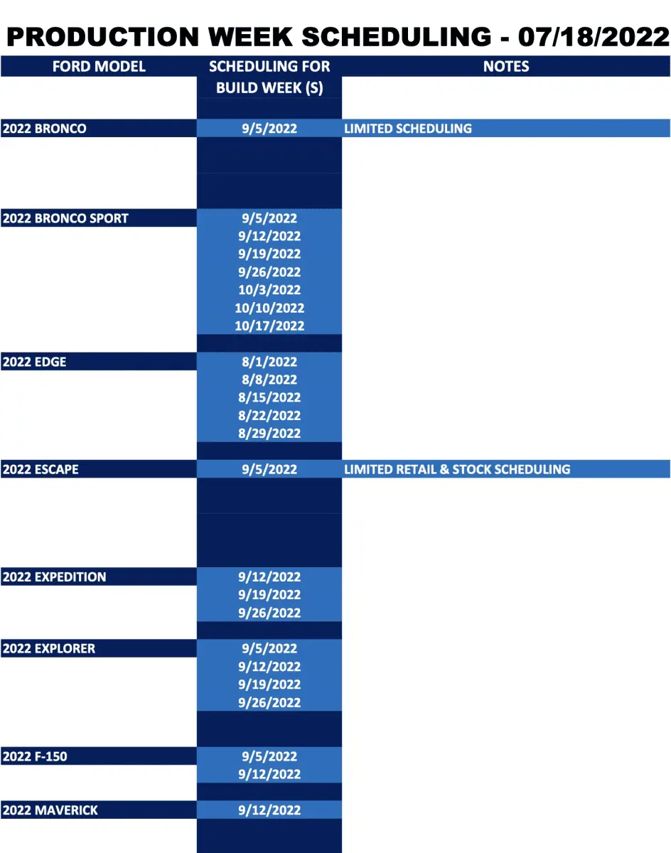 As noted in other threads, there has been a surge of BR scheduling this week (mostly yesterday/Thursday) even though this was not on the Ford calendar. Seems like most of this was for build weeks thru the end of August 8/29. Next week we once again have a "limited scheduling" event, and only for the build week of 9/5. Who knows what will *actually* happen...