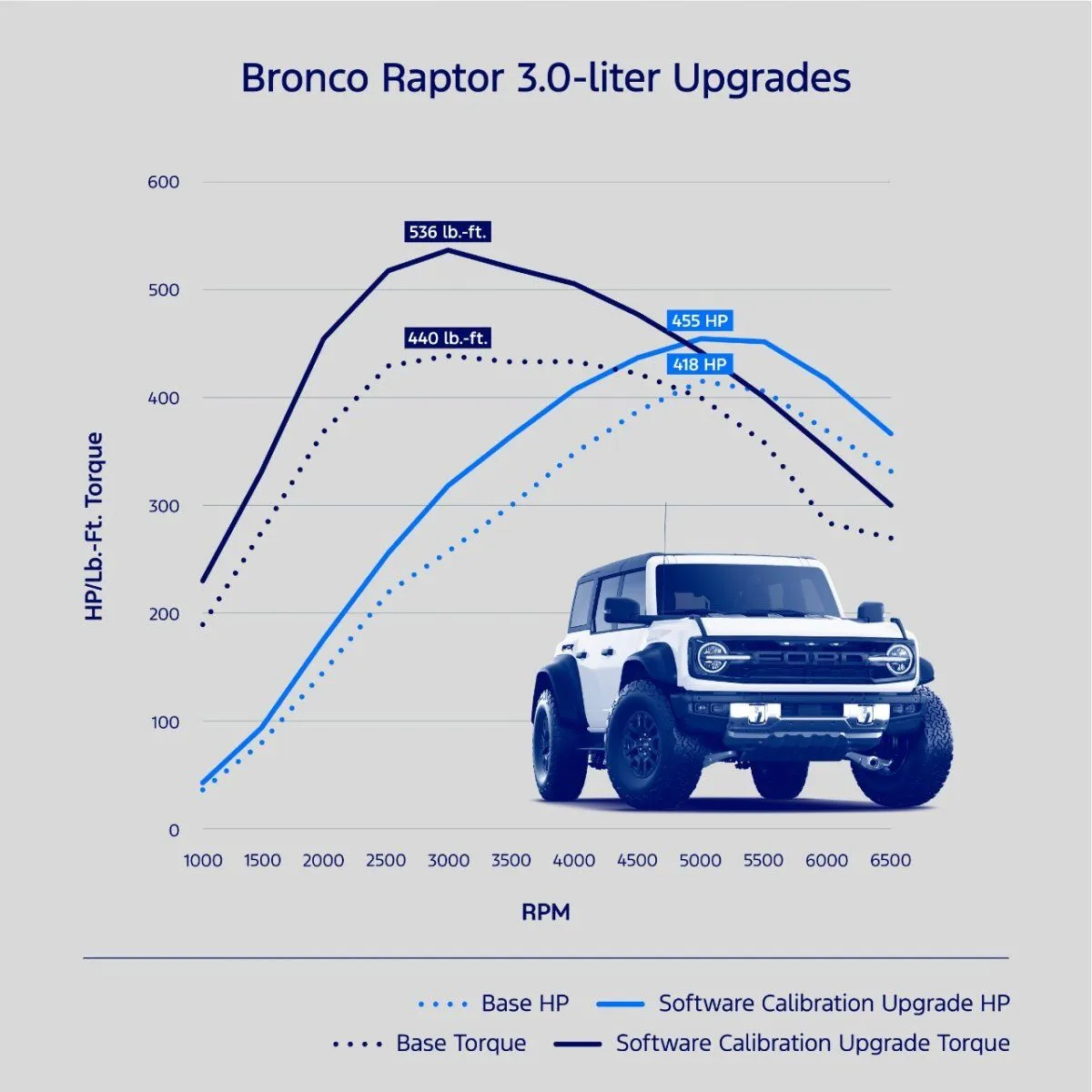- Bronco Raptor: Torque increases from 440 to 536 lb.-ft. and horsepower climbs from 418 to 455