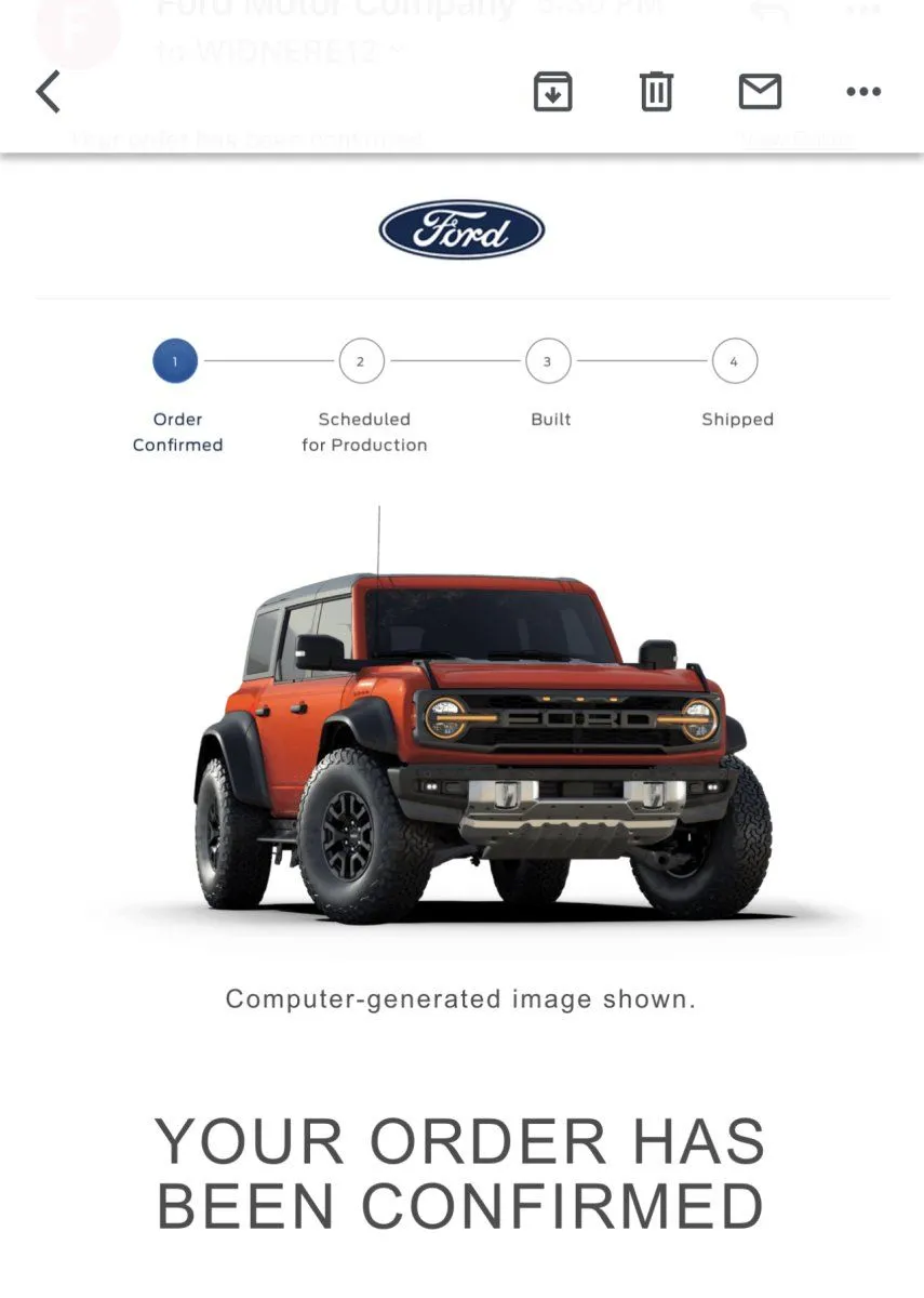 By waiting a few more weeks, you will have a year newer Bronco Raptor, when mine is considered 2 years old in the market yours will be 1 year old. I think you will make it up in the end.Agreed...my build went from $79,670 to $84,465 for the exact same build...