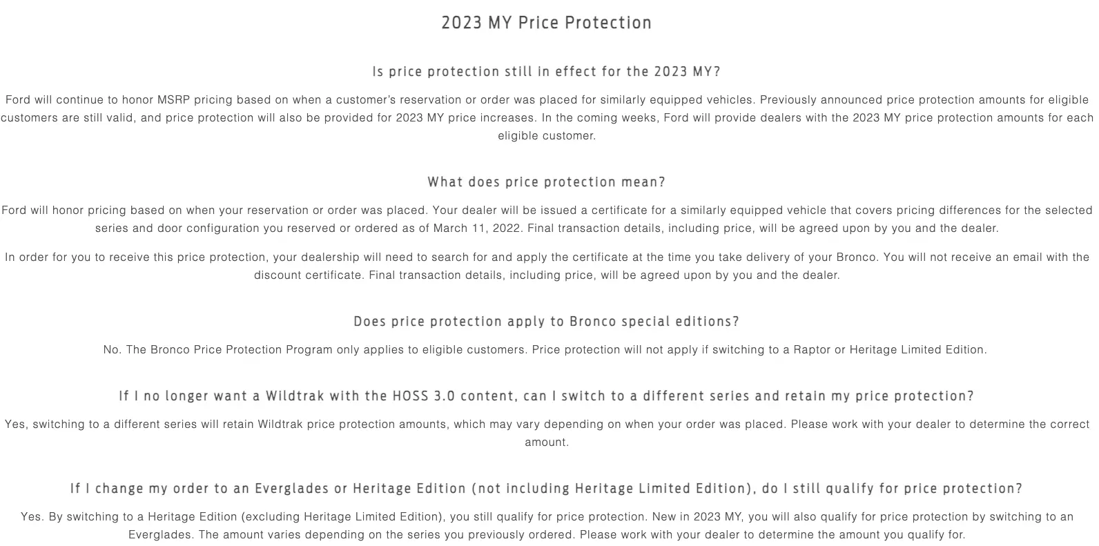 My backdoor link is the same with all of the 2022 pricing. I printed this out and hope it stays. My DORA sheet from the dealer has the new MSRP with a $4900 increase for my build. I have gotten conflicting stories on price protection for the 2023 Bronco Raptor. Hoping Ford does the right thing.I got bumped to 23 as well, I got my 23 order in yesterday. Check the backdoor site today my order is updated to a 2023, but the pricing on that page stayed the same as 22 pricing. Has anyone else noticed that?