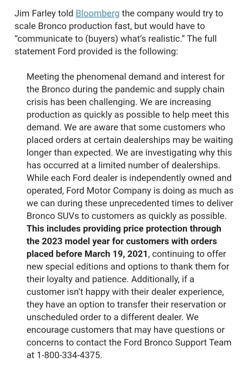 I'm not exactly sure when this came out. I do know on February 11th 2022 in an interview to Bloomberg, Jim Farley stated, "The company is also making good on last year’s pricing for early customers who have yet to get their SUV and is letting customers transfer their orders to different dealers." I think above may be a revised statement of this.wow when did that come out?