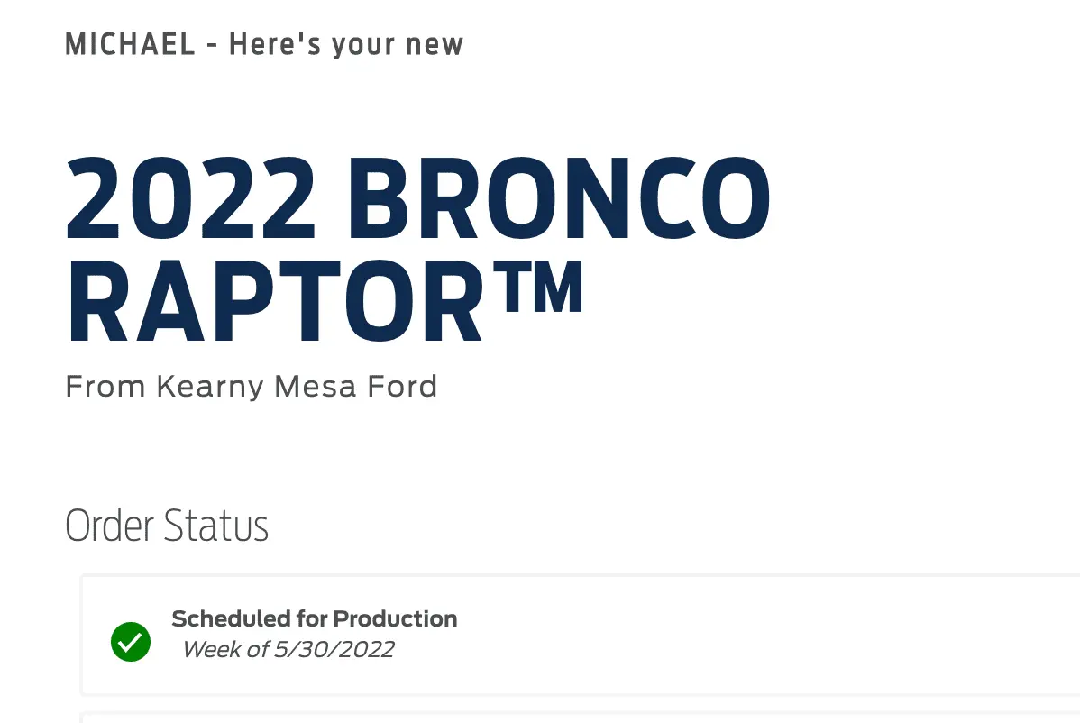 I was wondering when we will get ours since they are built the same week. I am hoping that info changes. I know I just saw a regular Bronco built and delivered in 2 weeks. My Subaru was ordered, built and delivered in three weeks. I hope Ford does something to get these to us quickly.
