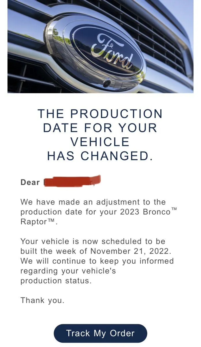 Looks like our Bronco Raptors are being built along the same week as I have also received this same email.patience is what I’m working on….still just patience.