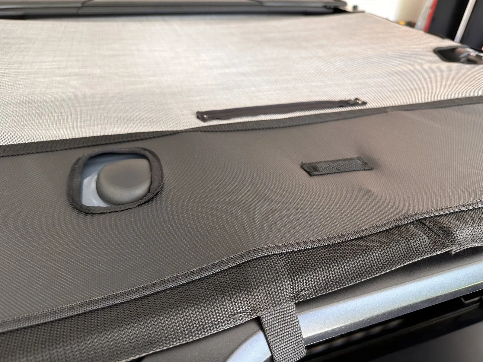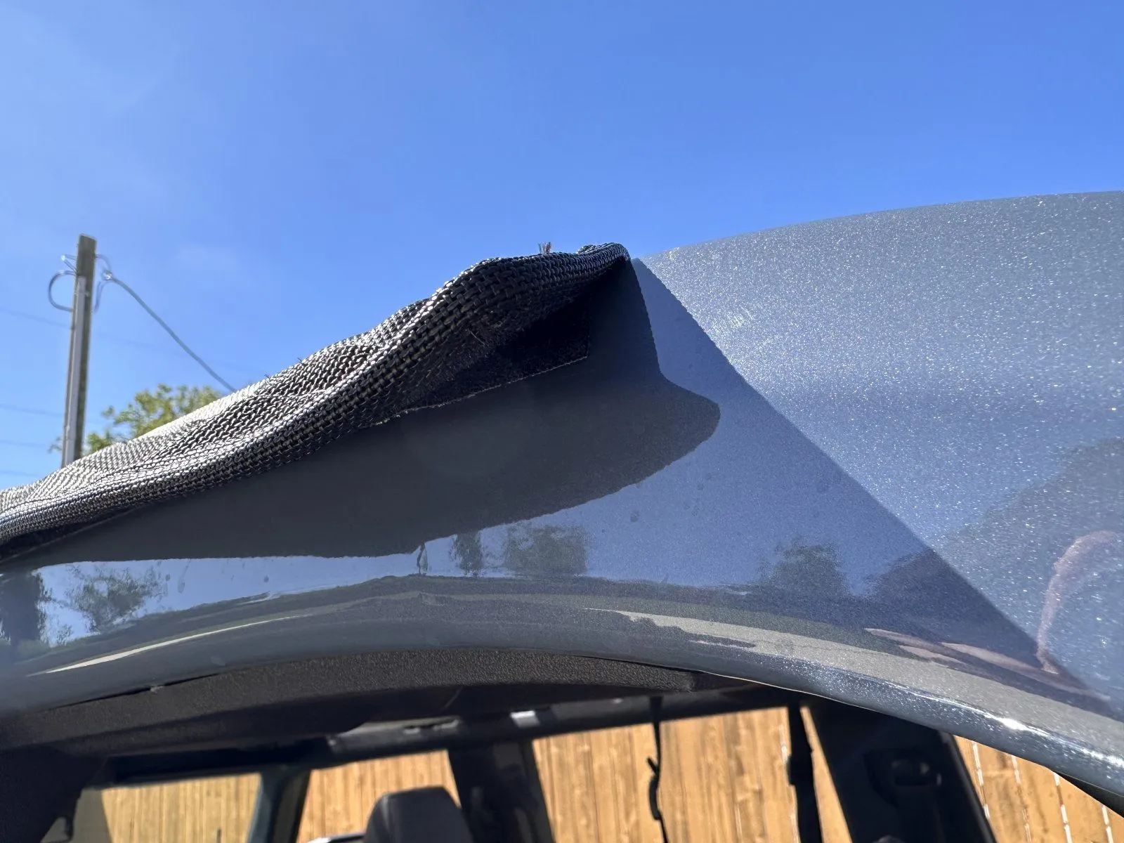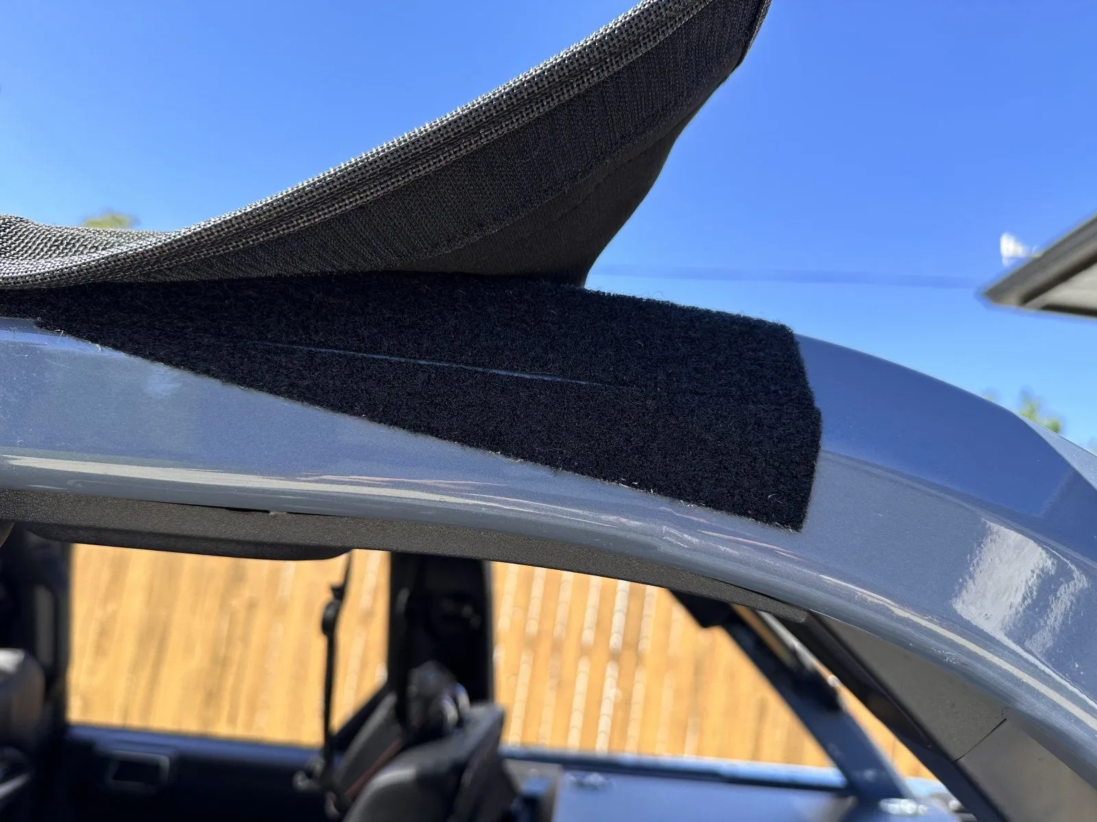 While I was at it I had noticed that there was a push-pin protruding through the c-pillar that was also pushing into the JTop vinyl. Concerned about an eventual tear I popped it out and trimmed it down a bit. Once the new Velcro sets overnight and I’m able to re-install I’m expecting that rubbing issue to be taken care of. I’m the second pic below you can barely see the point that I’m speaking of. That was before I had really tightened those straps down and it became more apparent after I got it as tight as I could.