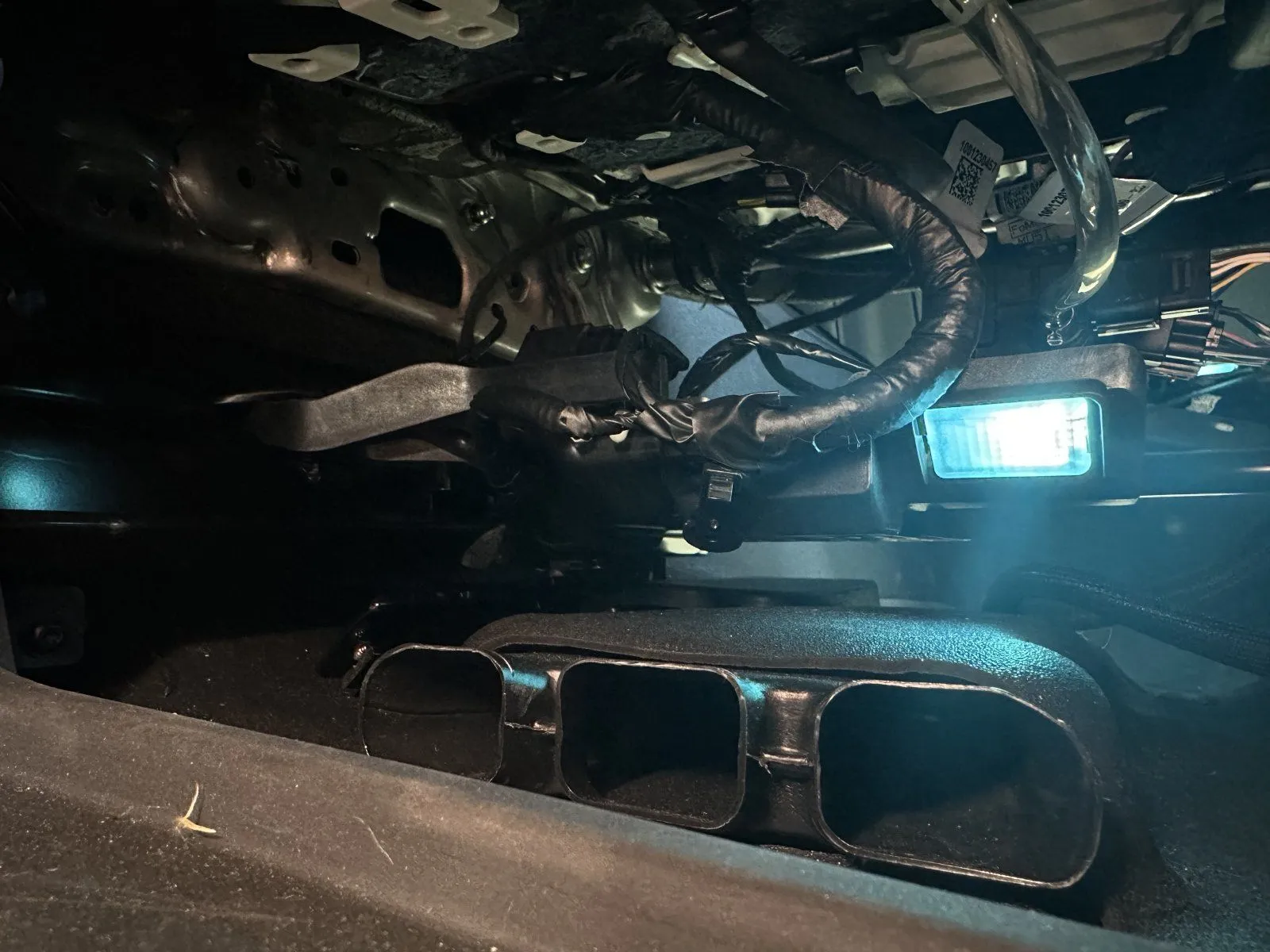 This looks great! Do you have any other install information or photos you can share with us? I would be interested to see exactly what you did down there to make it look so clean and functional.rear footwell lighting tied into oem harness and using oem lights