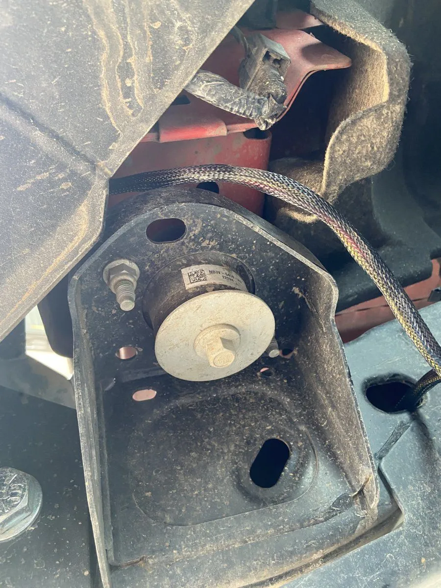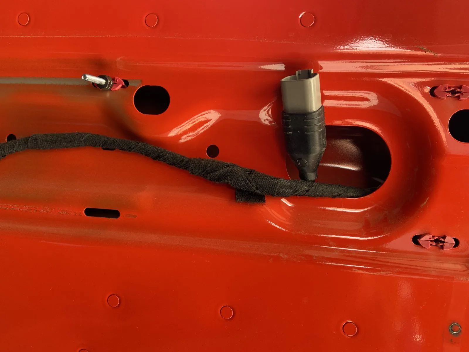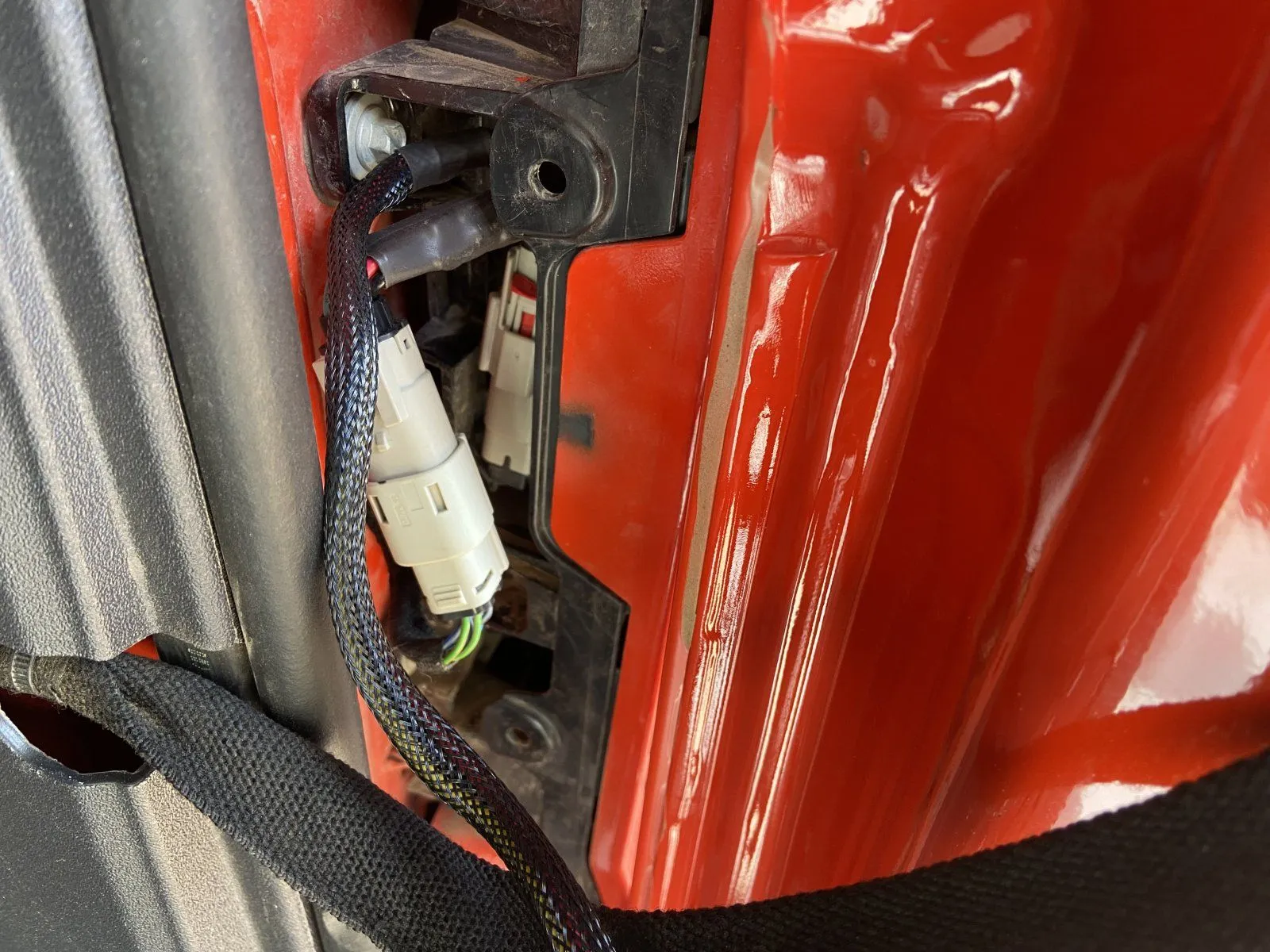 This is the way the video tells you to route harness as it comes down through the bumper. I decided to go behind the bolt/bushing but then still go through the frame as seen on the right. I think this reduces the risk of something snagging the harness