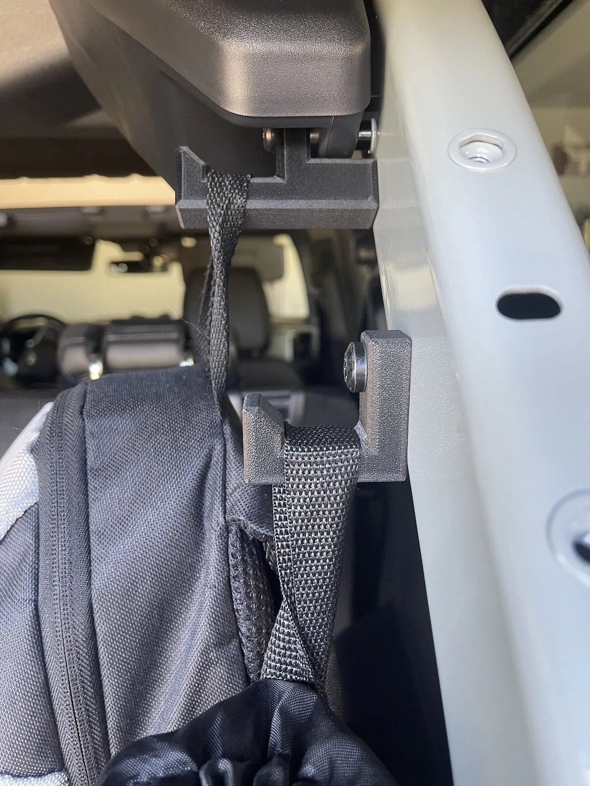 I thought it would be nice to have a hook in the back of the Bronco for dry cleaning, jackets, hats, gear, etc. So, I decided to make one! Here is my V1 Gear Hook for the Ford Bronco that uses a pre-existing threaded hole on the back roll bar. There is a hole on each side of the roll bar so I will be including a pair of hooks along with mounting bolts. The hooks are made of High-Modulus Carbon Fiber for extra strength and durability. It also has a nice MIC (Moded In Color) look to it. The mounting bolt in the pictures below is for testing only. The final bolts will be pan head Torx bolts and I hope to have those in soon. Let me know if anyone is interested in a set of hooks for the Bronco!